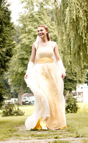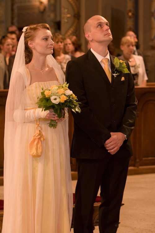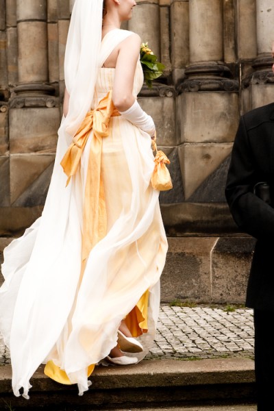 Takhle se v létě vdávala má kamarádka, herečka a zpěvačka Irenka (teď už) Musilová. Byly to mé první svatební šaty na zakázku. Jsem ráda, že jsme se shodly na tom, že svatební šaty nemusí mít korzet a desítky metrů tylu : ).
